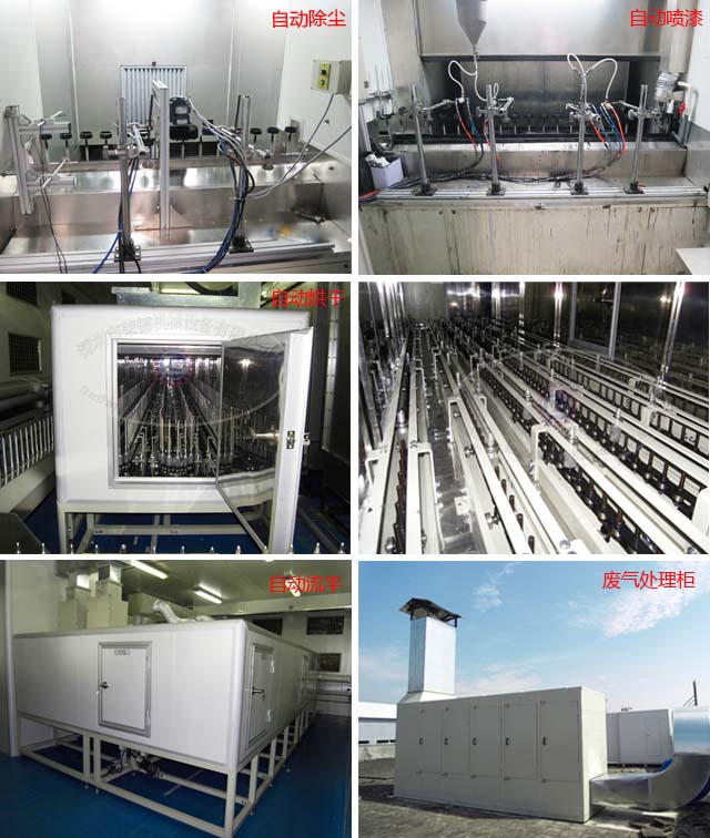 人工上下件、自動輸送線、手動除塵/靜電自動除塵、預(yù)熱除濕、自動噴涂設(shè)備(往復(fù)機、機器人等)、凈化車間、漆霧排風(fēng)系統(tǒng)、恒溫恒濕送風(fēng)系統(tǒng)、高效均壓箱、產(chǎn)品表面流平、烘干、冷卻系統(tǒng)、中央控制系統(tǒng)、廢水廢氣處理系統(tǒng)等等